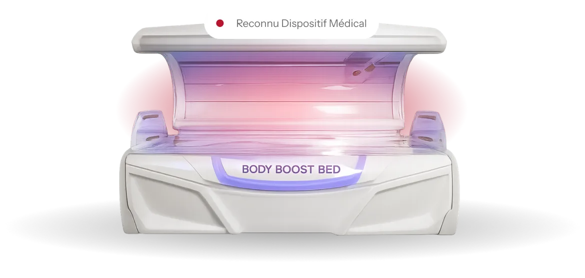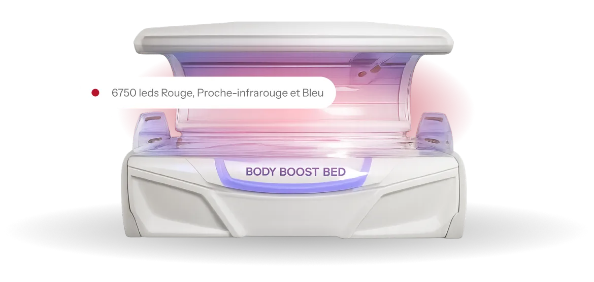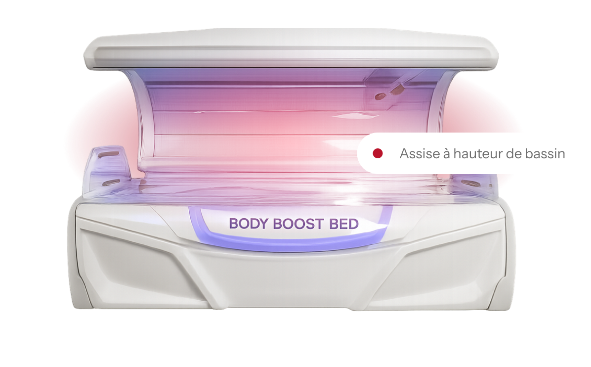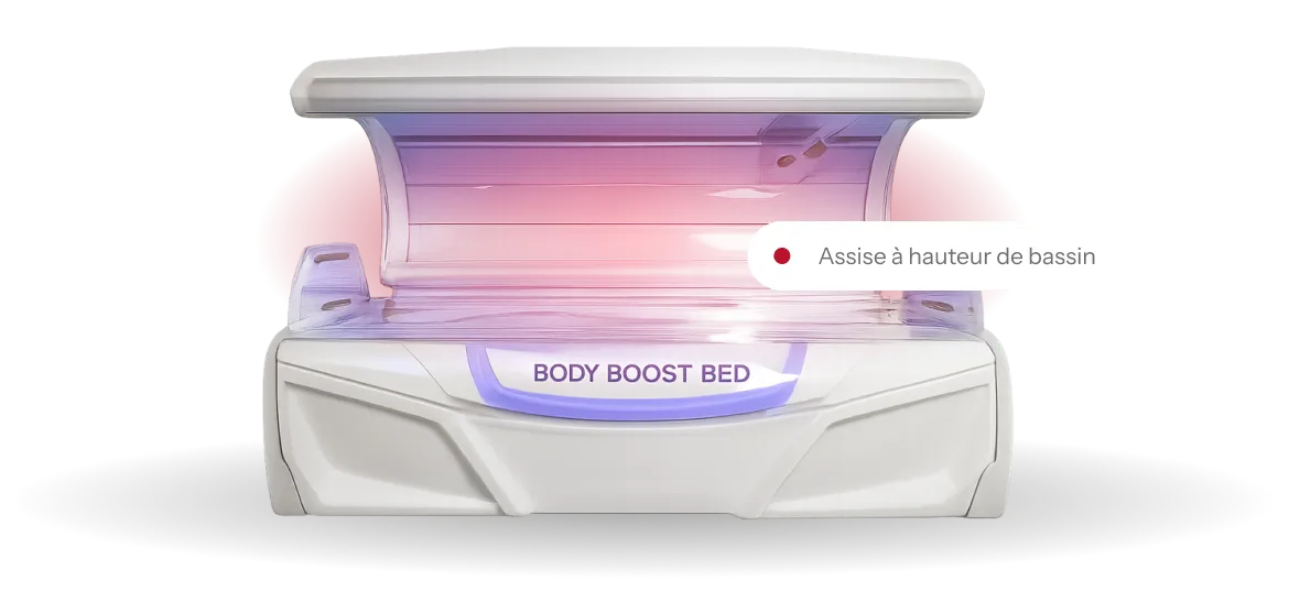 Le Body Boost Bed diffuse des longueurs d’onde rouges et proche-infrarouges sur l’ensemble du corps pour stimuler l’énergie cellulaire, réduire les tensions musculaires et favoriser la récupération.